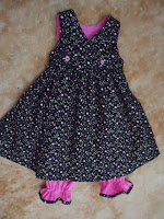 The black floral with pink is the same pattern but I have added a strip of the plain pink to the top of the bodice & smocked it in black thread to highlight the black floral fabric... the bloomers are plain pink with matching bloomer edges made of the black floral fabric..